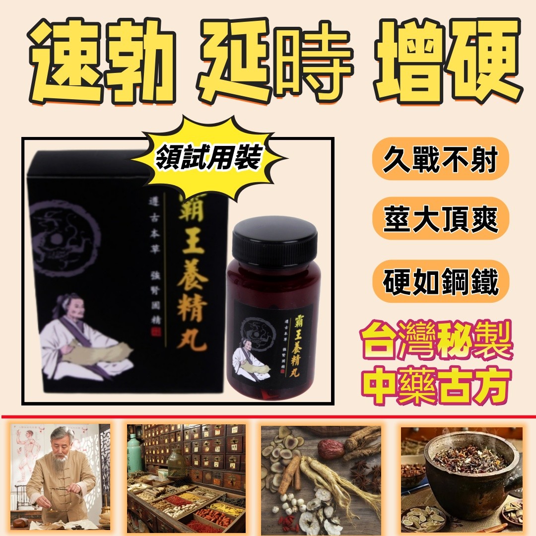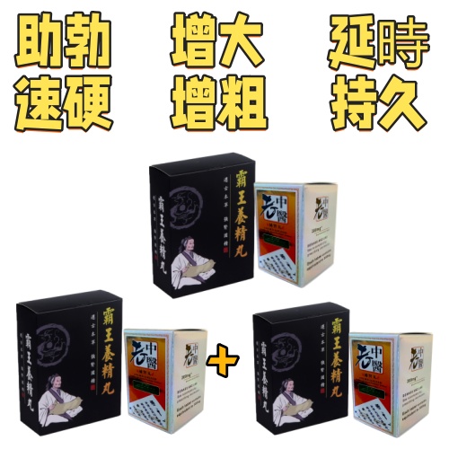 (霸王養精丸+老中醫)套裝藥: 全部採用台灣地道藥材-溫補腎陽,提升補益中元陽的想效果,更有調心氣藥材,使心腎相交,進而強精壯脛,補百損,天然的男性中醫神藥,含有豐富的營養素,滋養睪丸,二次發育,增大增粗,讓陰莖內部快速充血